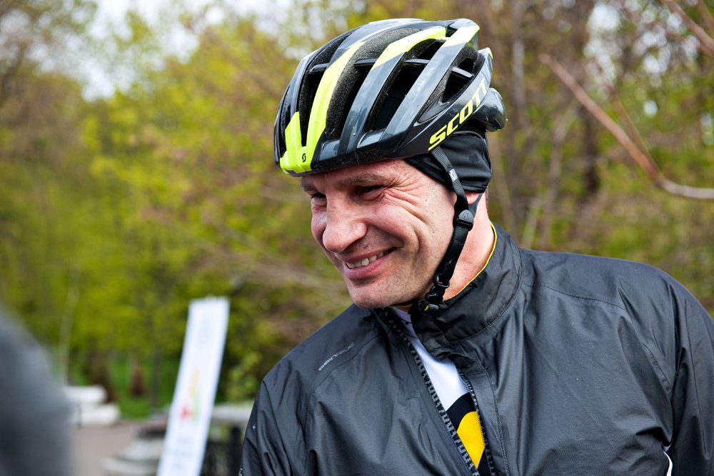 Квітень 2017. Мер Києва захищає голову під час акції «Велосипедом на роботу» в Маріїнському парку. Разом з Кличком у велозаїзді взяла участь Уляна Супрун. Організатори акції – Асоціація велосипедистів Києва.