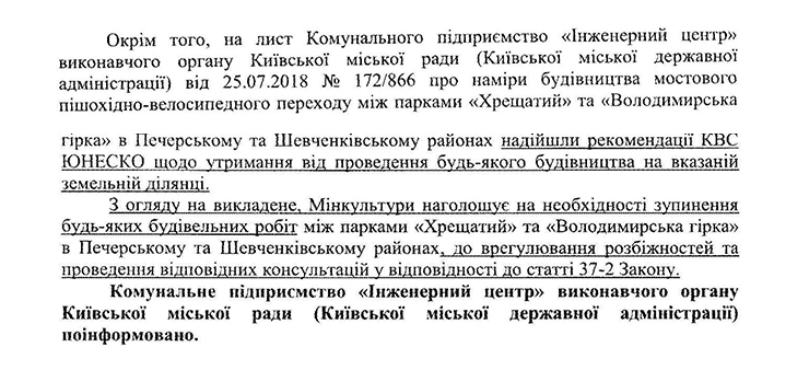 У листі підкреслюється, що перед початком будь-яких робіт необхідно повідомляти ЮНЕСКО. Мінкульт наголошує на необхідності зупинення усіх будівельних робіт між Володимирською гіркою та парком «Хрещатий».