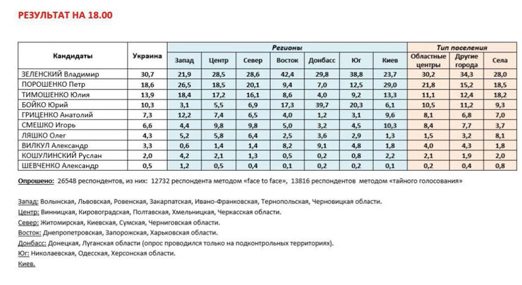 Разом з тим, один з екзит-полів, зроблений на замовлення телеканалів 112 та NewsOne, опублікував результати голосування виборців у Києві. Згідно з дослідженням, в столиці Петро Порошенко набирає 29% голосів, Володимир Зеленський – 23,7%, Юлія Тимошенко – 13,3%, Ігор Смешко – 10,3%, Анатолій Гриценко – 9,6%, Юрій Бойко – 6,1%.