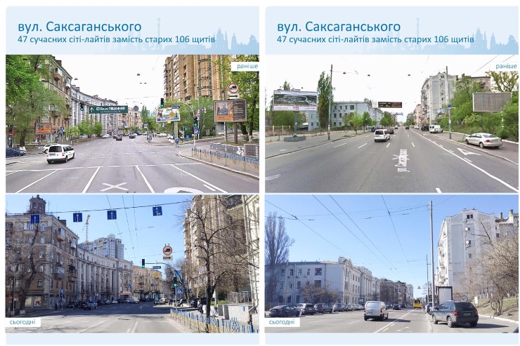 Станом на 3 квітня на вулиці Саксаганського замість 106 рекламних щитів розміщено 47 сітілайтів. Про це повідомив начальник управління з питань реклами КМДА Олександр Смирнов.