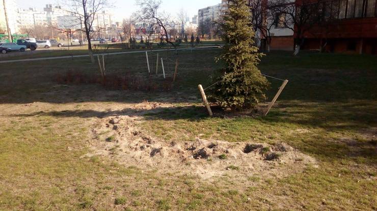 У сквері на вулиці Маяковського, 2Б, де встановлено пам’ятник Воїну-добровольцю, невідомі викопали за кілька днів 329 саджанців, повідомляє КП УЗН Деснянського району.