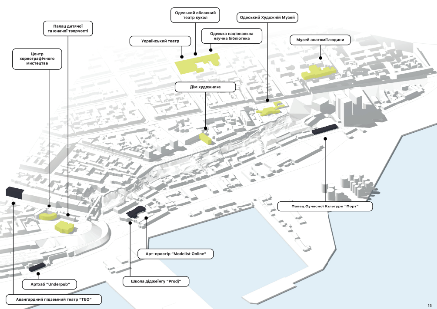 Самі Схили знаходяться на перетині культурно протилежних частин міста: власне, «міста», де розташовані Одеський художній музей, Український театр і Обласний театр ляльок, та «антиміста» – зеленої зони зі школою діджеїнгу, артхабом та авангардним підземним театром.
