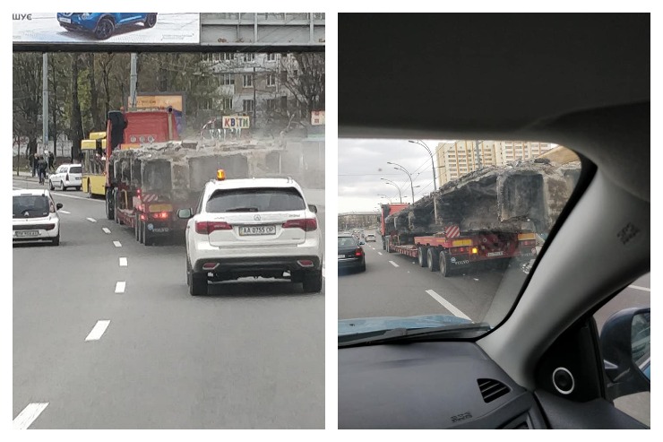 На дорогах Києва почали фіксувати вантажівки з рештками Шулявського шляхопроводу. Містяни пропонують, зокрема, розбирати демонтовані частини на сувеніри.