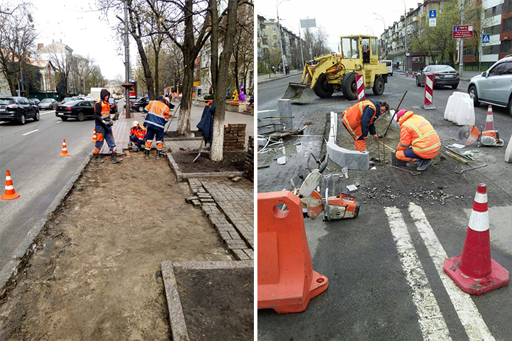 Облаштування паркувальних кишень на вулиці Мазепи (ліворуч) і острівця безпеки на проспекті Миру (праворуч). Фото: КК «Київавтодор»