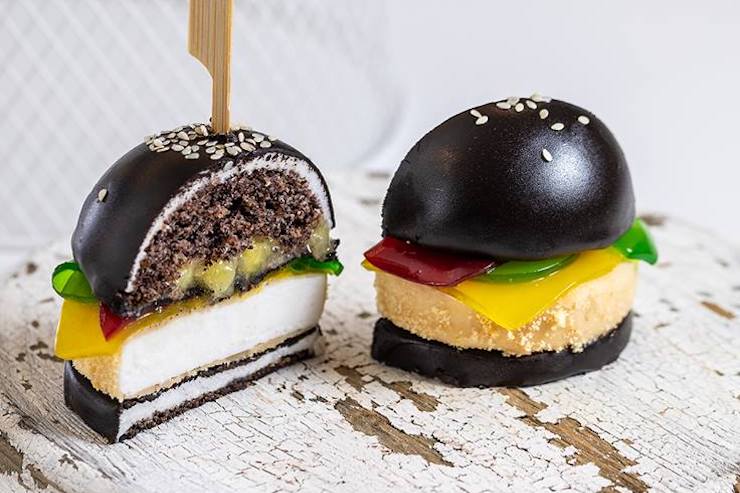 Тут готують тістечка у формі фотоапарату, серця, помади, бургера та художньої палітри. Так, тістечко-бургер (74 грн) зроблено з макового бісквіта, мусу з кокосового пюре й ананасового компоте.