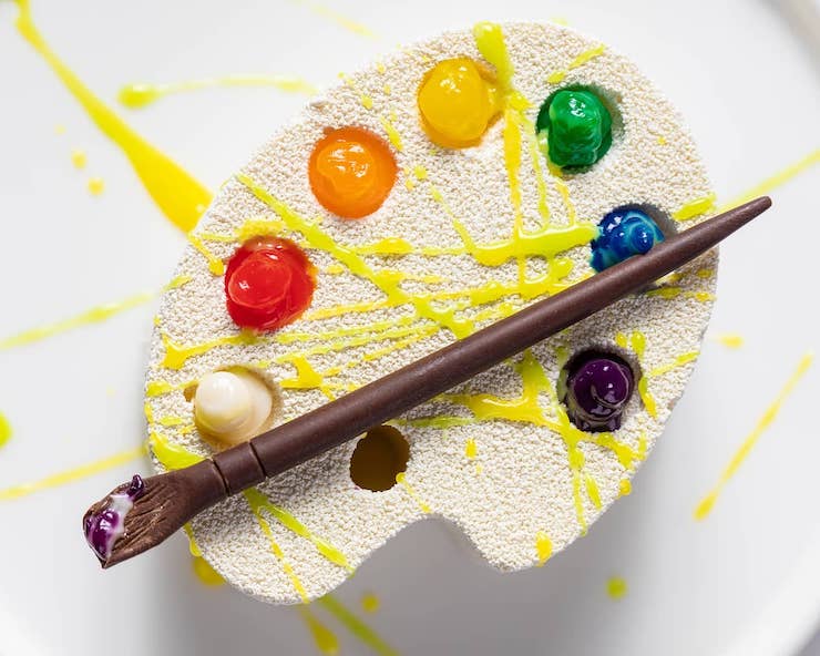 Всередині тістечка у вигляді палітри з фарбами (130 грн) – крем-чіз мохіто з м’ятою та лаймом і прошарок апельсинового конфітюру в лимонному мусі.
