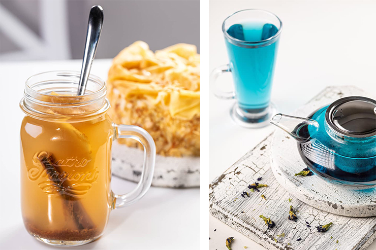 Ліворуч чай «Яблучний штрудель», праворуч – синій чай із квітів кліторії. Фото: Vam_bakery