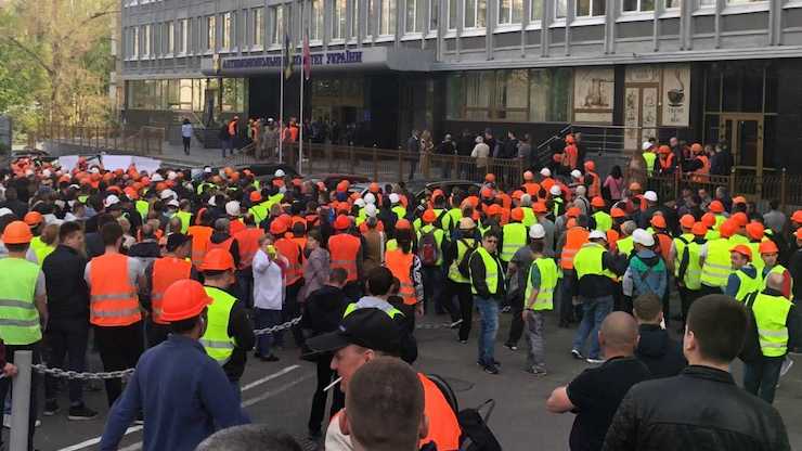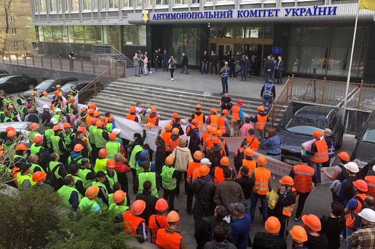 25 квітня перед будівлею Антимонопольного комітету України пройшов мітинг кількасот будівельників, які працюють на підрядника, що будує Шулявський шляхопровід.