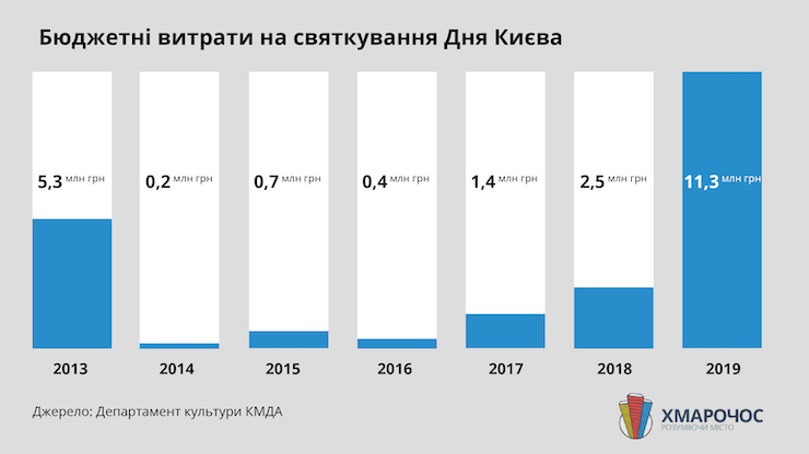 Це рекордна сума з 2013 року. Найдешевше обійшовся День Києва у 2014 році: тоді кошторис обмежили 266 тисячами гривень.