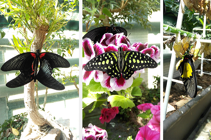 В оранжереї живуть такі види, як Блакитний Місяць (Hypolimnas bolina), Повітряний Змій (Idea leuconoe), Метелик-Сова (Caligo memnon), Метелик-Павич (Papilio palinurus) та Пурпурна Троянда (Pachliopta kotzebuea). Експозиція оновлюється новими видами.