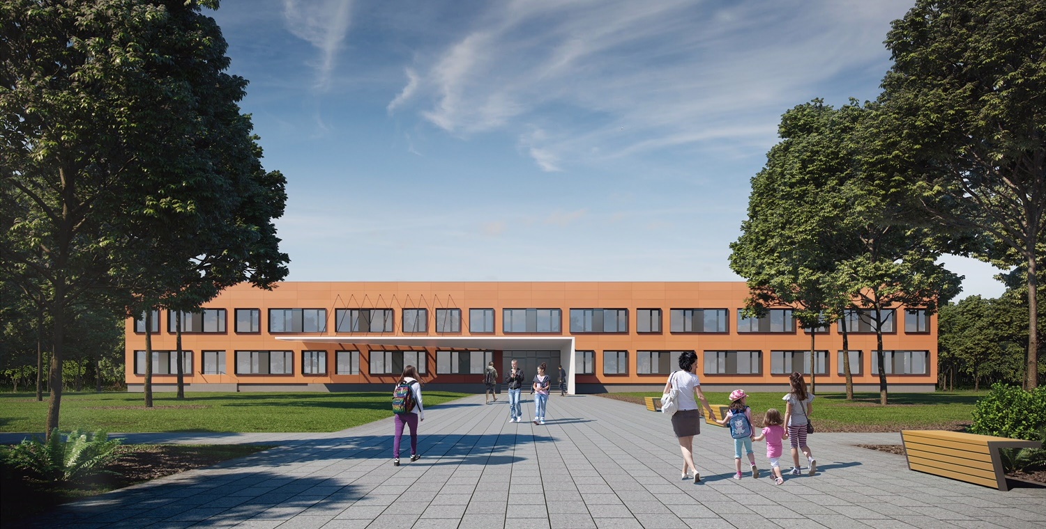 У школі зробили енергоефективний фасад з червоної фіброплитки (облицювальний матеріал з майже відсутньою займистістю; здатен утримувати тепло), а на даху встановили сонячні панелі. На вході облаштували пандус.