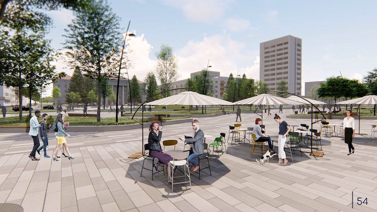 Проект передбачає підтримку активних фасадів на перших поверхах будинків, де розташовано кафе й магазини.