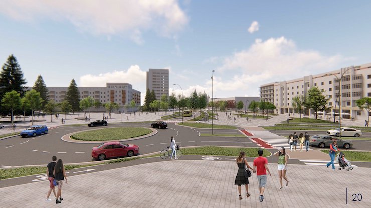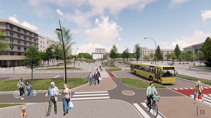 Ключовою пропозицією авторів є зменшення транспортного транзиту через майдани та створення орієнтованого на пішоходів простору з зеленим променадом. Площу для проїзду і нелегального паркування буде суттєво зменшено.