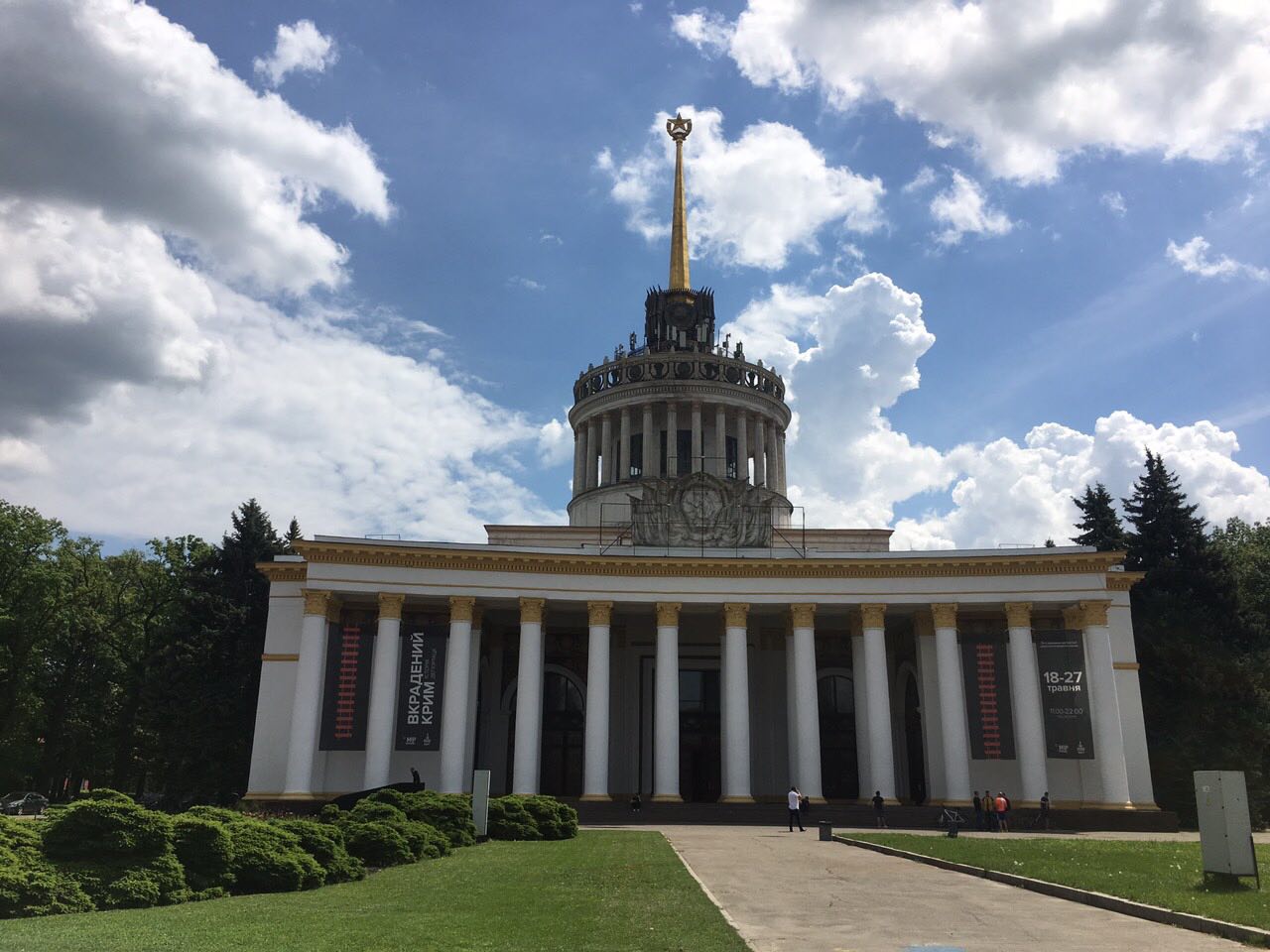 Архітектурний ансамбль ВДНГ збудували у 1952-1958 роках. Він поєднує безліч стилів, від античного класицизму і бароко до модернізму та конструктивізму. Наприклад, будівлі мають колони доричного, іонічного, коринфського і тосканського ордерів. Головний павільйон ВДНГ – головна домінанта ансамблю.