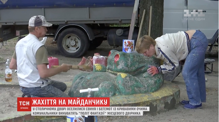 Виправляти роботу прийшли семеро комунальних працівників. Вони принесли кілька інших кольорів, а також спробували почистити фігури та облущити шари старої фарби. Як виявилося, на свині залишилися бежеві, жовті, зелені, салатові шари.