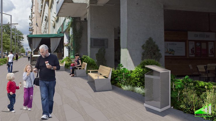 Розробка передбачає додаткове озеленення та облаштування місць для відпочинку – у презентації видно чимало лав.