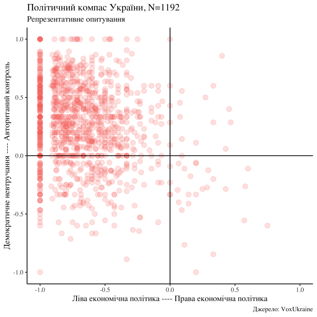 Громадська організація VoxUkraine та Київська школа економіки провели дослідження, метою якою було встановити ідеологічні вподобання українців. Організатори презентували результати за вибіркою 1200 респондентів.