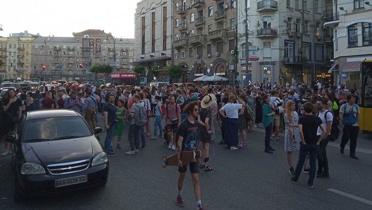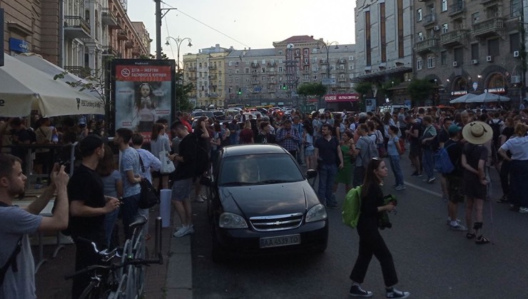 Трьома автівками кияни перекрили відрізок вулиці Велика Васильківська. В результаті утворився затор, у якому стоїть й громадський транспорт. На акції є декілька поліцейських, які слідкують за правопорядком.