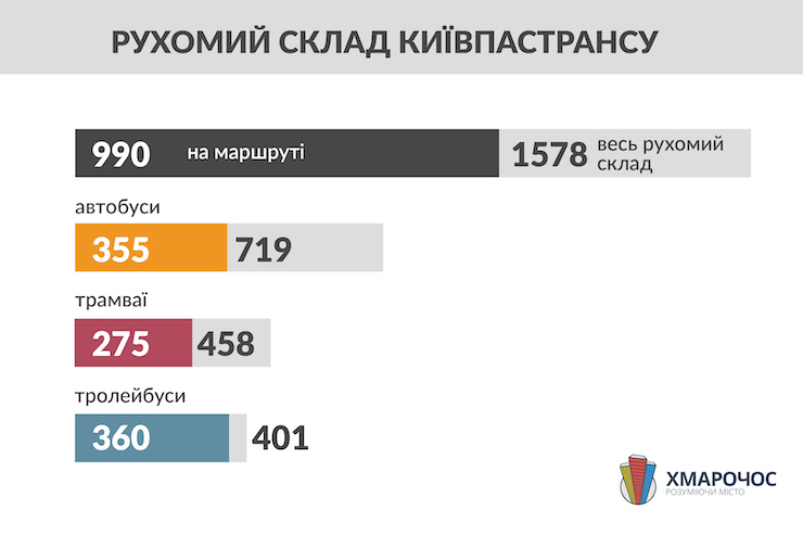 Не всі вони виходять на маршрути, зокрема, через потребу в ремонті. Навіть у години пік працюють 355 автобусів, 275 трамваїв, 360 тролейбусів (62%), а також 135 комунальних маршруток (загалом 71% від загальної кількості).
