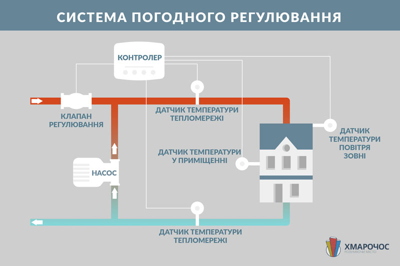 Система погодного регулювання дозволяє змінювати температуру теплоносія (води) в системі опалення залежно від температури повітря зовні: знижувати її, коли на вулиці тепло і підвищувати, – коли холодно. Ця система складається з датчиків, контролерів та клапанів. Датчик зовнішнього повітря вимірює температуру на вулиці. Два датчики на подавальному і зворотному трубопроводі вимірюють температуру тепломережі. Логічний запрограмований контролер обчислює необхідну різницю і керуючи клапаном регулює швидкість потоку теплоносія.