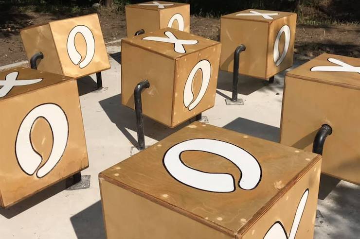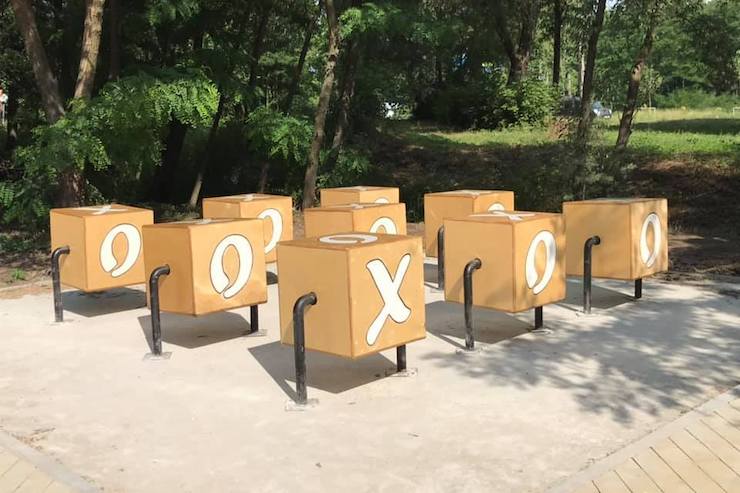 Працівники «Київзеленбуду» встановили у парку «Перемога» дев’ять дерев’яних кубиків розміром пів на пів метра. Конструкція призначена для гри у хрестики-нолики.
