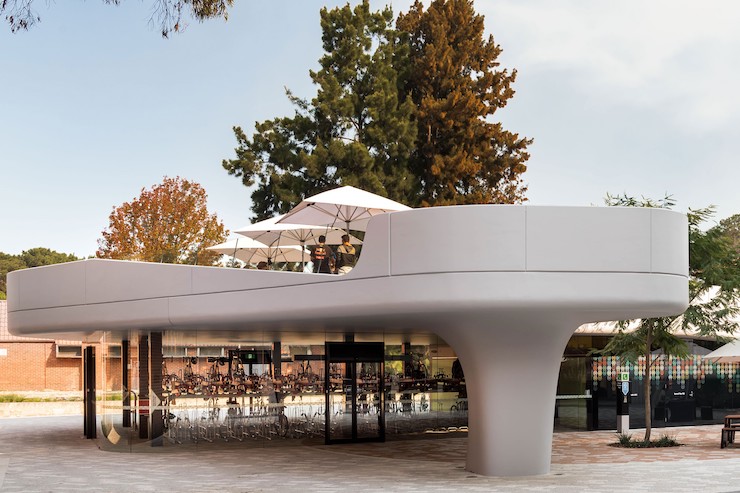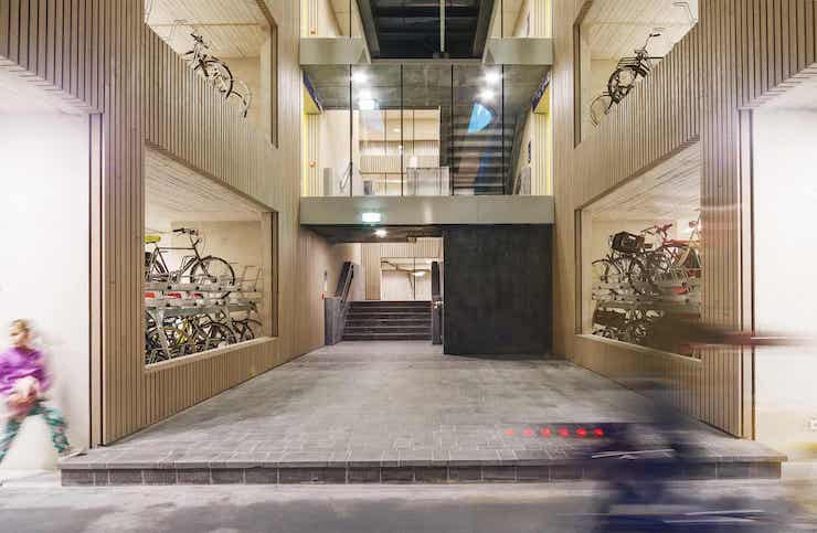 Велосипедний хаб в університеті міста Перті, Австралія, спроектований Coniglio Ainsworth Architects, включає мийку, дворівневу парковку на 200 байків та громадський простір на даху, який можна використовувати для проведення подій.
