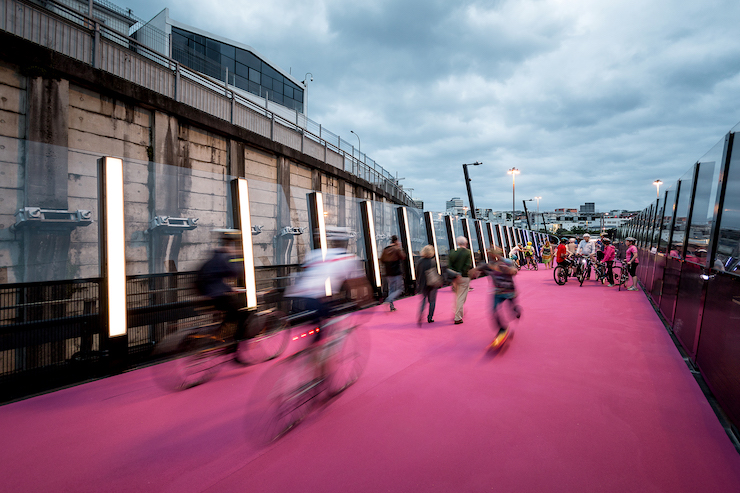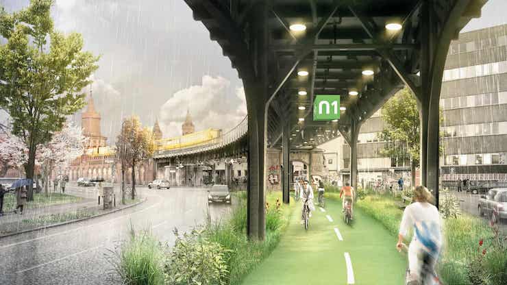 Спроектовану бюро Paper Planes велодоріжку у Берліні зроблено з переробленого пластику. Обабіч висадили рослини, аби зменшити рівень шуму від вулиці.