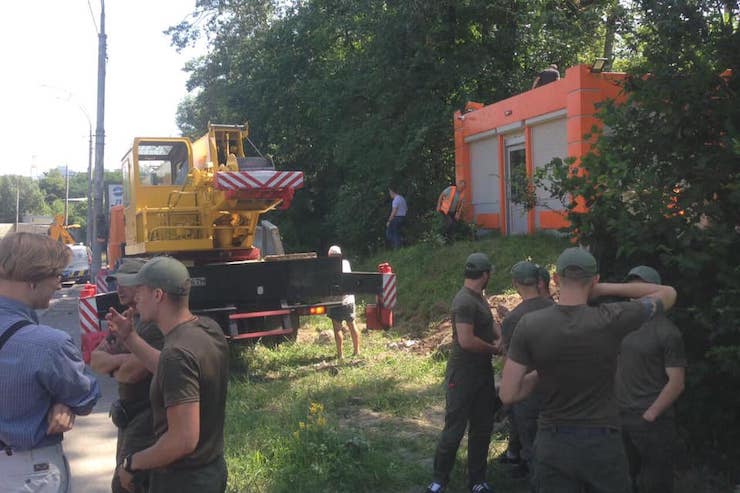Раніше супротивники забудови повалили паркан навколо ділянки, і тепер повідомляють, що забудовник намагається його відновити. За словами активіста Романа Ратушного, забудовник підігнав техніку, щоб прибрати МАФ, який заважає встановлювати новий паркан.