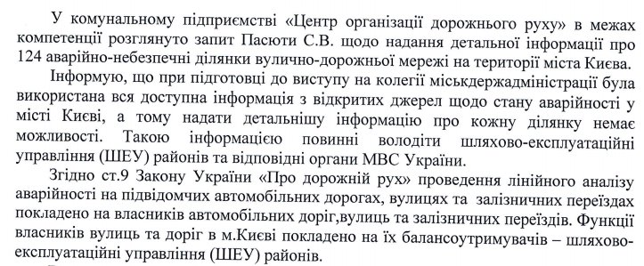 Пасюта також розповідає, що спроб дізнатися дані було декілька. Спершу КМДА перенаправила його до Патрульної поліції, однак там відповіли, що запит стосується інших структур. За другої спроби КМДА спробувала розібратися самостійно, направивши запити до райдержадміністрацій, районних ШЕУ. Тоді ж і виявилось, що дані про 124 аварійні зони мають надати у ЦОДР Києва за їхнім статутам. Проте керівник ЦОДР заявив, що не в змозі розібратися.