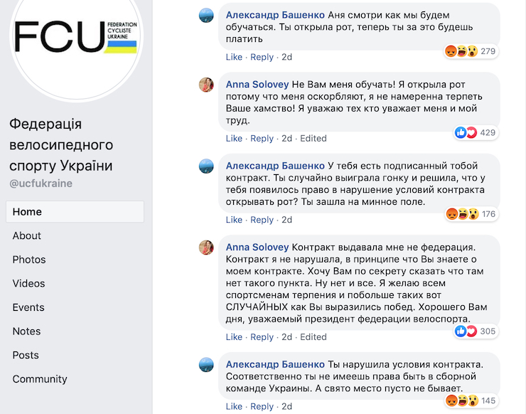 Президент Федерації велоспорту України Олександр Башенко відповів на це зауваження образами та погрозами.
