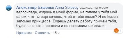 «Їздиш на моєму велосипеді, їздиш у моїй формі, на голові у тебе мій шолом. Будеш смердіти – проженемо і не згадаємо як звали», – додав Башенко.