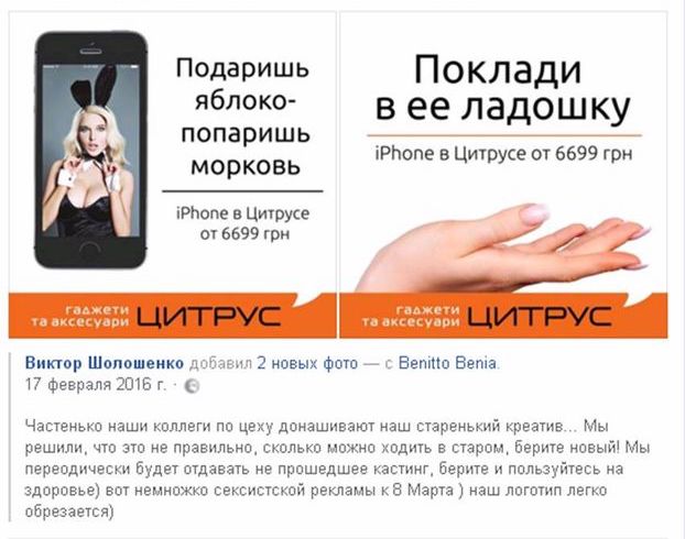 Маркетинговий директор мережі «Цитрус» Віктор Шолошенко заявив тоді, що серед зображень, які обурили правозахисників, два було зроблено як навмисний фейк. Він також додав скріншот свого старого посту, в якому він пропонував іншим компаніям позичити ці два забракованих зображення в якості секситської реклами до Восьмого березня.
