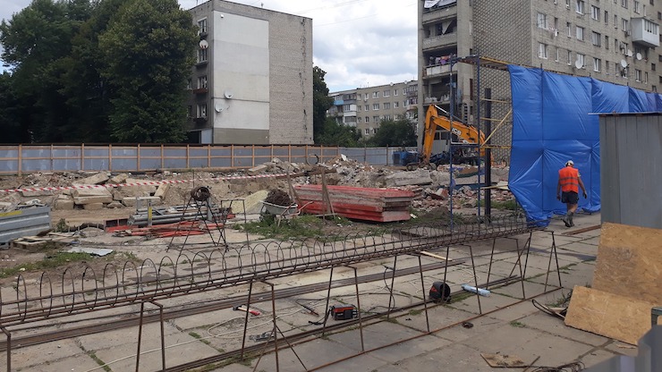 На вулиці Володимира Великого у Львові забудовник знищив мозаїку рибного магазину «Океан», повідомляє Юрій Рудий. На фото також видно, що повністю знесено саму будівлю, збудовану 1982 року.