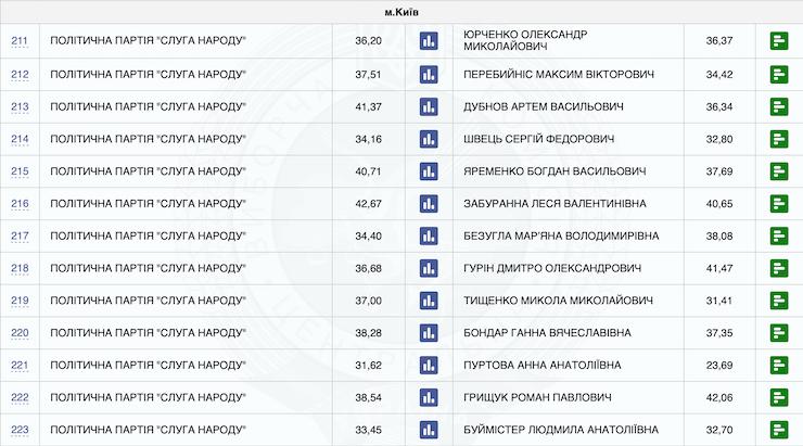 Зокрема, у 212 окрузі кандидат від «Слуги» обійшов екс-голову КМДА Олександра Попова, київського депутата-«свободівця» Ігоря Мірошниченка, сина Анатолія Гриценка Олексія, якому не допомогла креативна агітація за мотивами «Гри престолів», голову «Київської команди» у Київраді Сергія Гусовського та Олександра Карпюка з «Демократичної сокири».