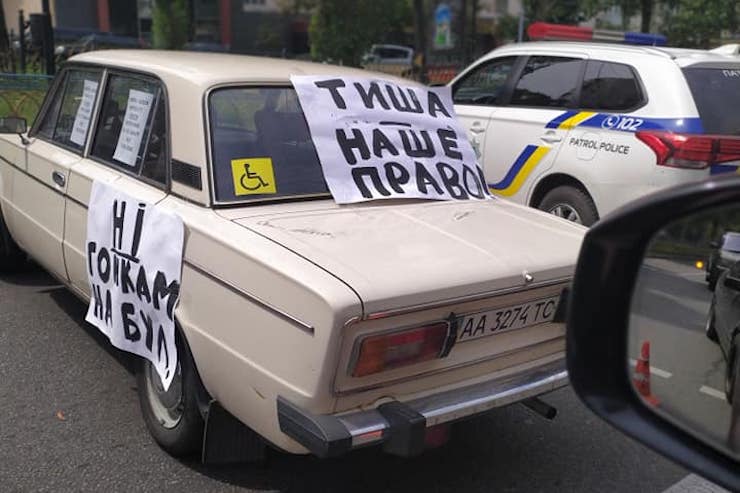 На машині, яка перекрила дві смуги, було розміщено плакати «Ні гонкам на бульварі» і «Тиша – наше право». Місцеві мешканці зазначають, що вночі тут справді гучно їздить транспорт на високій швидкості.