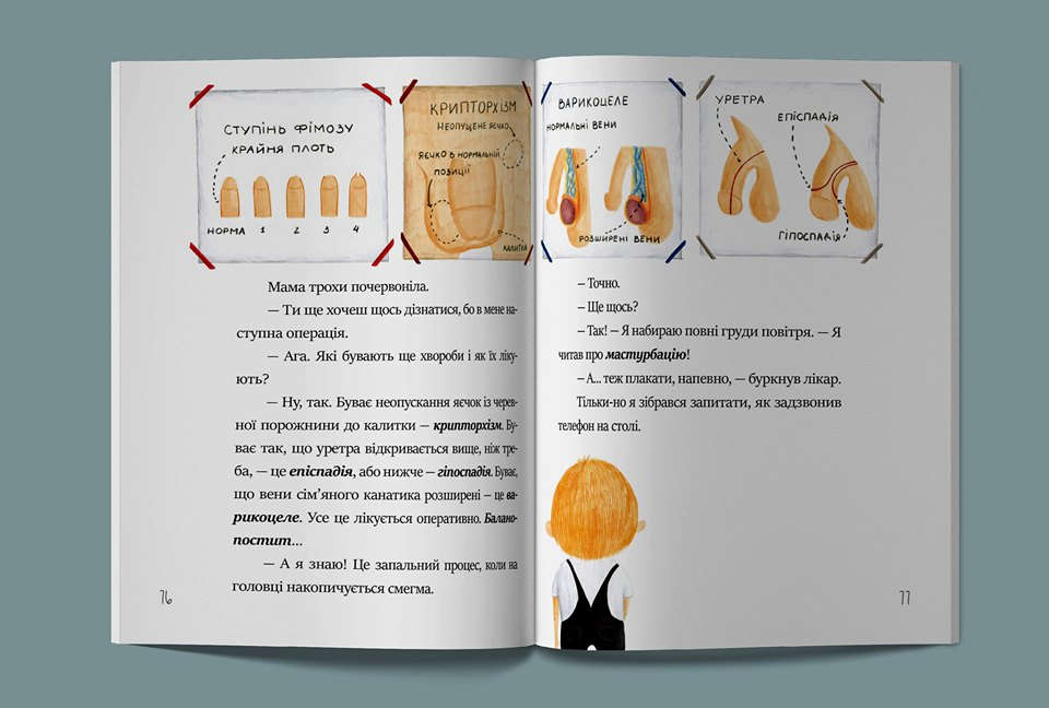 У книзі пояснюють, наприклад, як чоловічі геніталії відрізняються від жіночих, що таке секс, мастурбація, фімоз, приватна інтимність та чому дітям не варто соромитись говорити про біль у паховій зоні.