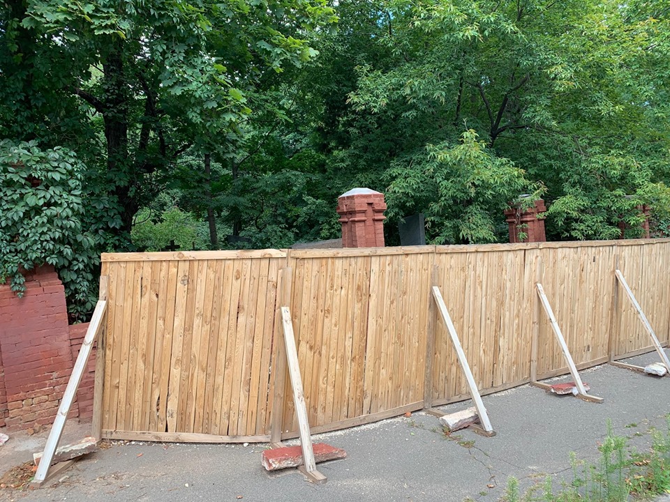 Поки що вздовж цегляної стіни встигли встановити будівельні огорожі, а з її окремих секцій познімали металеві оградки.