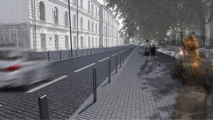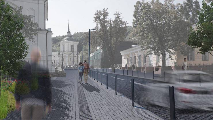 Як видно з рендерів, асфальт на проїжджій частині буде замінено бруківкою.