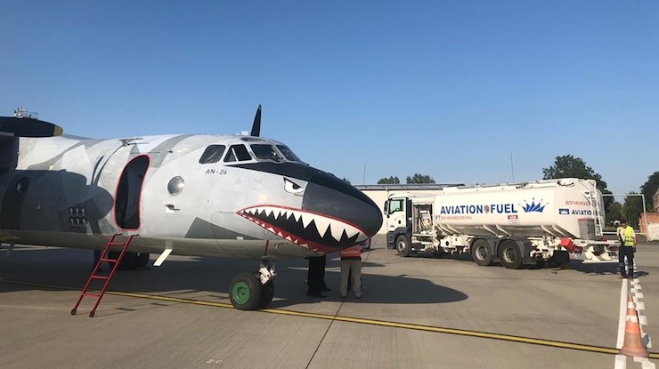 На фото зображено вантажний літак Ан-26 із зображенням пащі акули в носовій частині та черепа з вороном у хвостовій. Як зазначає avianews.com, таку ліврею було створено для зйомок у бойовику «Нестримні 3», що вийшов 2014 року. У ньому грали Сільвестр Сталлоне, Дольф Лундгрен, Арнольд Шварценеггер, Антоніо Бандерас, Мел Гібсон, Гаррісон Форд та низка інших кінозірок.