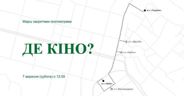 Хода розпочнеться о 12:00 біля кінотеатру «Україна», вул. Городецького, 5 і пройде повз усі муніципальні кінотеатри, які були закриті – «Дружба» (вул Хрещатик, 25),