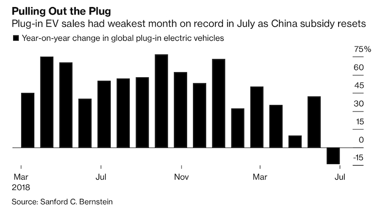 У липні вперше в історії було зафіксовано падіння глобальних продажів електромобілів, повідомляє Bloomberg із посиланням на сьогоднішній звіт Sanford C. Bernstein.