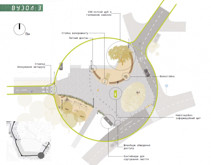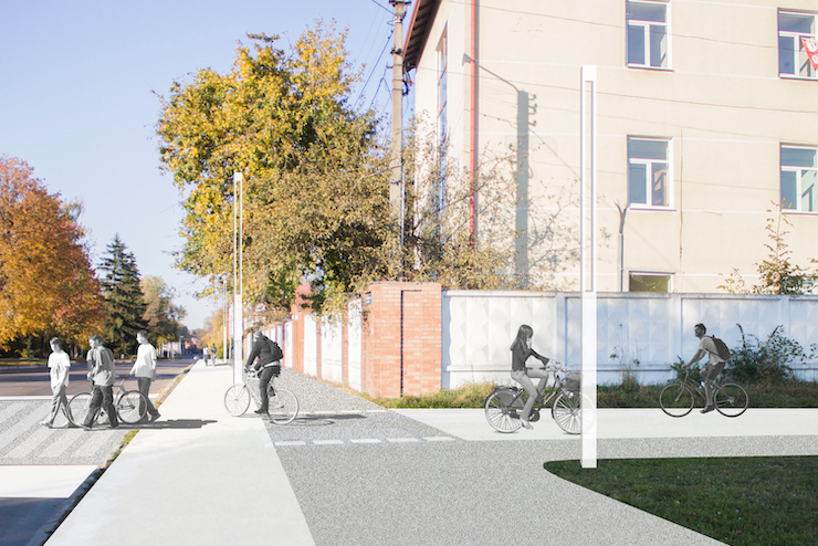 Місто. Планують утворити безперервну вулицю між двома храмами, греко-католицьким та євангелістським. За малої інтенсивності руху велосипедисти на цій ділянці рухатимуться проїжджою частиною.