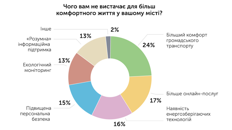 Найбільше українцям бракує комфорту в громадському транспорті. При цьому е-квиток та безконтактні способи оплати частіше використовують чоловіки, ніж жінки. Натомість жінки більше уваги приділили питанню екологічного моніторингу. Також велика кількість респондентів бажала би більшої кількості онлайн-послуг.