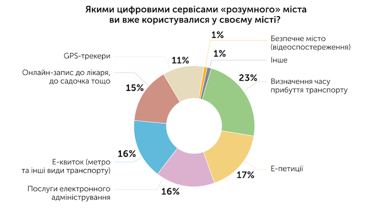 Серед цифрових сервісів, які вже доступні в містах, мешканці найчастіше користувалися сервісами визначення часу прибуття транспорту (наприклад, табло прибуття громадського транспорту, Telegram-бот київського метрополітену, застосунок EasyWay). Також опитувані відзначали появу таких сервісів, як адміністративні онлайн-послуги, можливість запису до лікаря онлайн, LED-освітлення вулиць.