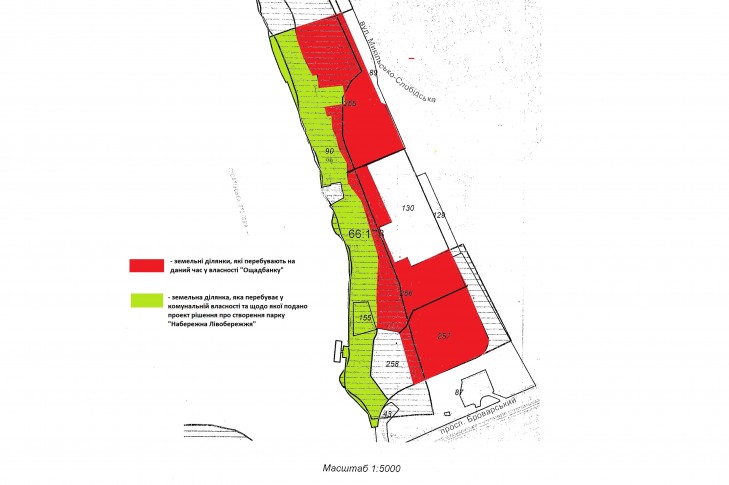 На кадастровій карті видно, що зазначені ділянки – це ті самі три ділянки на Микільській Слобідці, які Київрада вирішила викупити в Ощадбанка у травні цього року для будівництва парку.