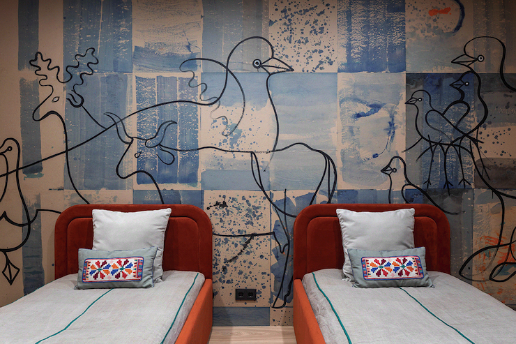 У кімнаті чотирирічного Тадао – також створені ним шпалери: спочатку батько наніс хаотичні плями синьої фарби на крафтові листки, а потім їх розписав художник Сергій Радько.