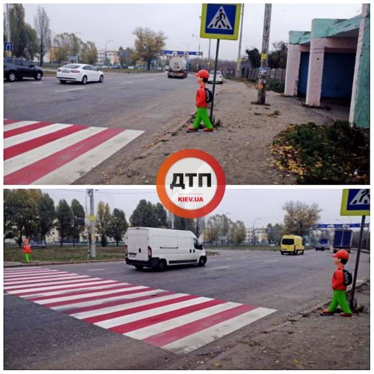На пішохідному переході на вулиці Академіка Заболотного, що у житловому масиві Теремки в Голосіївському районі, встановили пластикові муляжі школярів. Про це повідомляє dtp.kiev.ua.