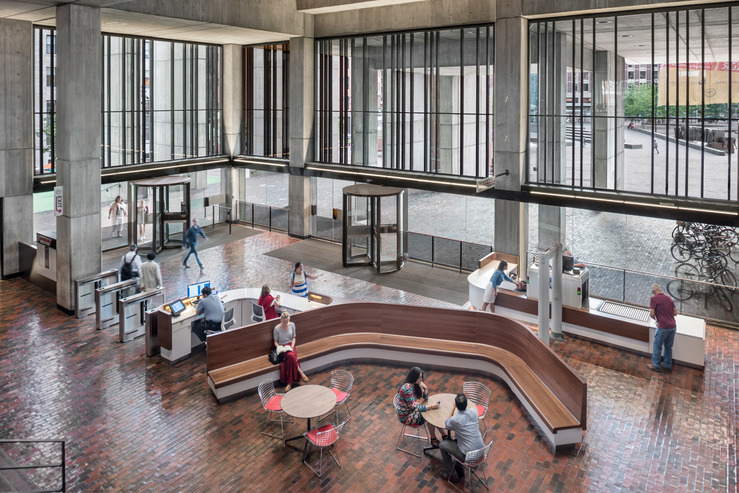 Однією з ключових змін була реорганізація фойє. Його зробили у вигляді просторогу входу з «втручаннями з меблів». Посередині першого поверху розмістили округлену дерев’яну форму, де є місця для сидіння та інформаційне віконце. Крім цього, така форма допомагає орієнтуватися в залі. Навпроти розмістили службу безпеки.