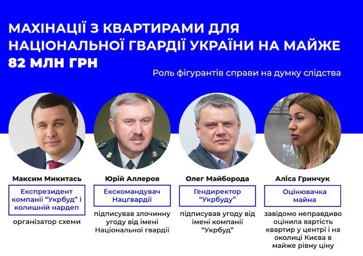 У травні цього року детективи НАБУ провели обшуки в «Укрбуді» та в офісах і домівках окремих службовців Нацгвардії. Було затримано екс-командувача Нацгвардії Юрія Аллерова, а також гендиректора «Укрбуду» Олега Майбороду й оцінювачку компанії Алісу Гринчук.