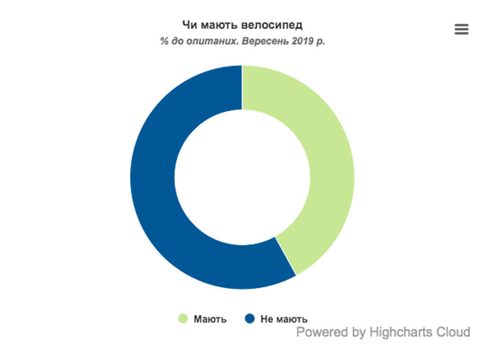 Проте володіє велосипедом удвічі менша кількість людей за ту, що вміє їздити. Зараз 42% жителів України мають власний велотранспорт, тоді як 58% не володіють ним.